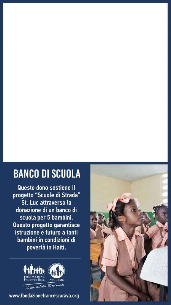 In Haiti 1 bambino su 4 non ha accesso alla scuola primaria e 1 ragazzo su 3 è completamente analfabeta. Ogni giorno le 37 Scuole di strada St. Luc, che includono una Scuola Secondaria e una Scuola Professionale, accolgono 16.000 bambini tra i 2 e i 16 anni nelle zone più degradate di Port au Prince e dell’isola. Per questi bambini andare a scuola significa prima di tutto sopravvivere: poter contare su un pasto caldo, ricevere periodicamente pasta e pane per la propria famiglia, essere vaccinati e curati, rimanere al riparo dai rischi della vita di strada, quali malavita e prostituzione. Le Scuole St. Luc vogliono garantire ai bambini un futuro lontano dalla povertà, dando loro un’istruzione che consenta di accedere a scuole riconosciute e di imparare un mestiere.